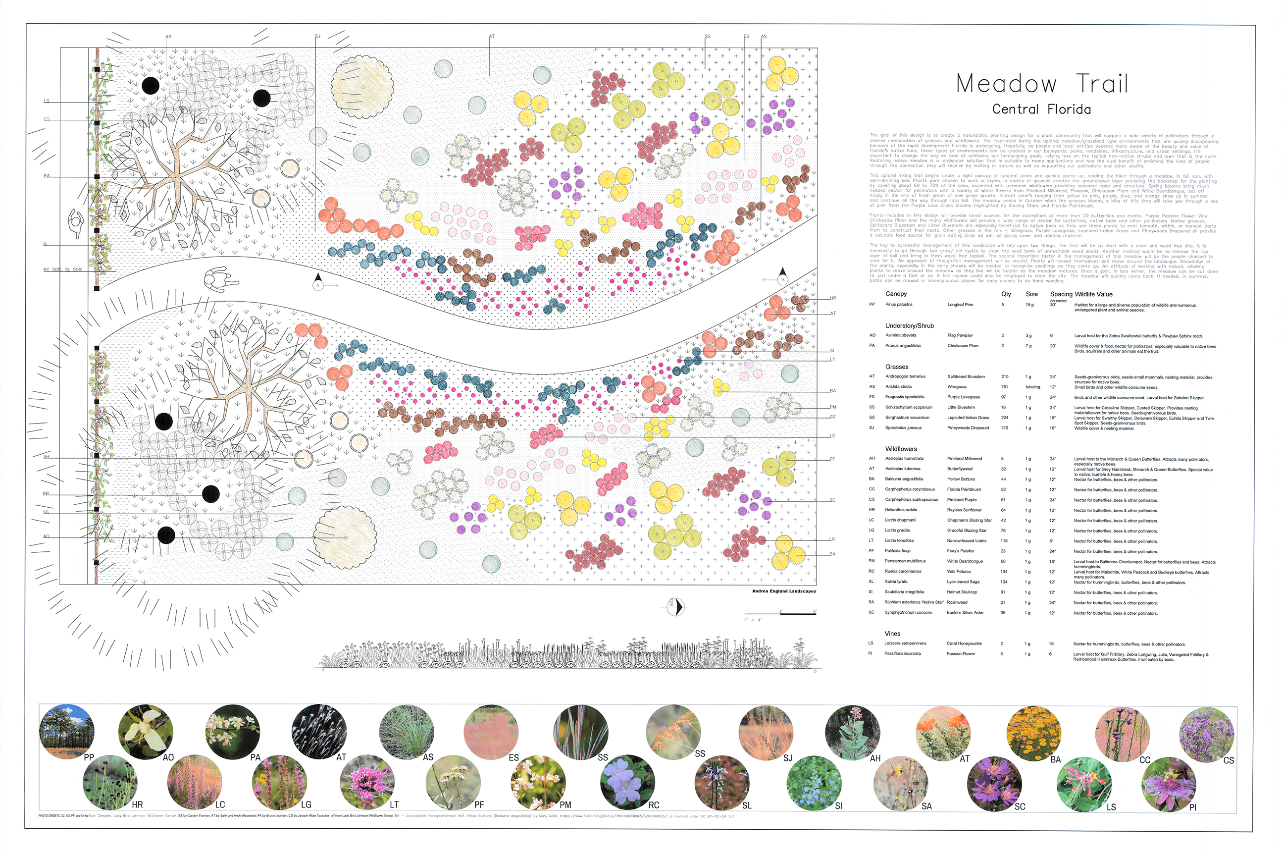 Andrea’s Meadow Trail, an upland hiking trail, is a naturalistic planted area supporting a variety of pollinators with a diverse combination of native grasses and wildflowers. Andrea was inspired to restore a type of ecosystem that is quickly disappearing as Florida is rapidly developed. The trail begins under a light canopy of Longleaf Pines and opens up into full sun. Successful maintenance of this plan would require starting with a clear and weed free site, going through two grow/kill cycles to clear the seed bank of undesirable weed seeds. Tolerance for plants reseeding and “moving” in the landscape will also be needed (the ever changing, not static, living landscape). The meadow can be cut down to just under a foot or so once a year in late winter to manage the appearance (or ideally burned!), and paths cut in for hand weeding accessibility. Click to review the design and see Andrea’s personal statement below.