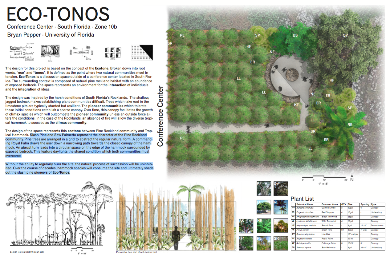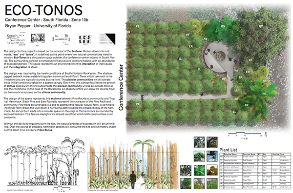 Bryan Pepper’s ECO-TONOS Conference Center design is based on the concept of the ecotone, a point where two natural communities meet in tension. Eco-tonos is a discussion space outside a conference center located in South Florida and is inspired by South Florida native plant communities. The surrounding context is composed of natural pine rockland habitat with an abundance of exposed bedrock. The space represents an environment for the interaction of individuals and the integration of ideas.