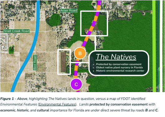 FDOT is considering four alternative routes for the road, three of which impact The Natives. Botanist Edwin Bridges has also noted the following impacts on native plants and habitat from the routes proposed: