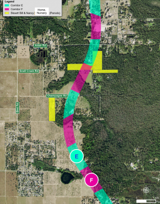 Proposed toll road extensions roll right over The Natives Nursery!MAY 19 UPDATE – The current E/F corridor passes over our main nursery and several of our lands that are under conservation easement (see attachment). It is uncomfortably close to Bill and Nancy’s house, it will demolish my seed production area, and main nursery as well as put a parkway between our two locations. We did meet with the FDOT team before the E/F corridor reveal and we were impressed with their cooperation in listening and thinking about other path options. We are somewhat optimistic that their will be a slight change in path at least out of the lowlands up to the higher soils before the next public meeting. We are in no way out of danger of this path, but the FDOT does respond to public outcry and has heard many voices in support of our business. I believe that we will know their final intent by August. We do thank everyone who has contacted the project manager Jazlyn Heywood Jazlyn.Heywood@dot.state.fl.us on our behalf. — Sarah Kiefer, daughter of Bill & Nancy Bissett and nursery manager