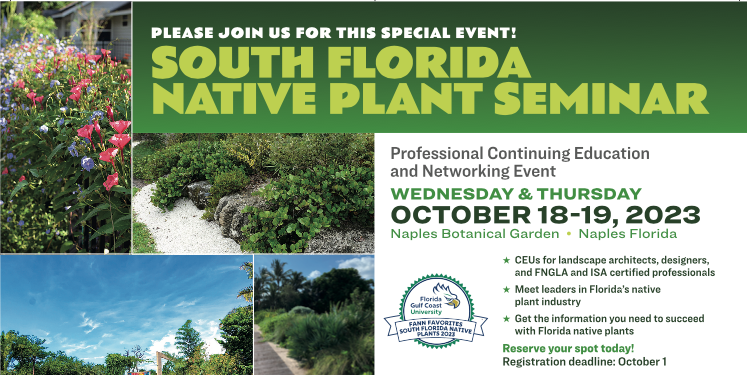 Attendee registration is now open for FANN’s South Florida Native Plant Seminar, a professional continuing education and networking event for landscape architects, designers, installers, landscapers, retail nursery staff and growers. Event takes place Wednesday and Thursday, Oct. 18-19, 2023, at the Kapnick Center at the beautiful Naples Botanical Garden in Naples, Florida. CEUs for landscape architects, ISA arborists and FNGLA certified professionals. Garden admission included and lots of time for networking. NEW: partnership with Florida Gulf Coast University includes state-of-the-art digital microdential pilot, FANN Favorites South Florida Native Plants 2023. Learn how to identify, use and maintain twenty of the best native plants available now for South Florida landscapes.