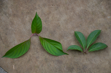 On the left, native Firebush leaves are broadly lanceolate, in whorls of 3-4 (typically 3, as shown here), and often tinged with red. Leaves and young stems are covered with appressed (flattened) hairs. On the right, non-native Firebush, of a variety frequently marketed as "dwarf" (but not dwarf), with glabrous (no hairs) leaves whorled in groups of 3-4 (typically 4, as shown here).